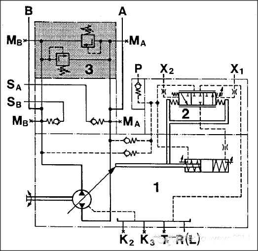 其中,半開/半閉式系統(tǒng)可以理解成開式和閉式的“混血兒”,通常需要通過預(yù)充閥對系統(tǒng)進(jìn)行補(bǔ)油。如下圖,這是一個典型的半開/半閉式泵,圖中SA和SB油口用來連接補(bǔ)油,通過補(bǔ)油單向閥(也可理解為預(yù)沖閥)對系統(tǒng)進(jìn)行補(bǔ)油。