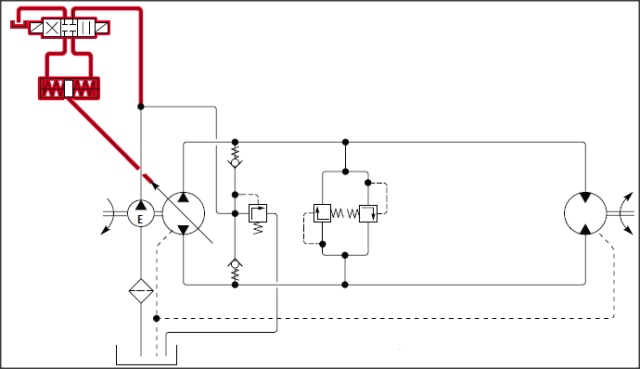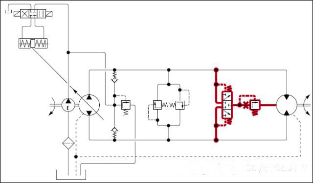 4:閉式系統(tǒng)中的控制回路,閉式系統(tǒng)中油液的流向改變是通過控制泵斜盤越過零位實(shí)現(xiàn)的。一般情況下,控制油是由補(bǔ)油泵提供(這種情況下,補(bǔ)油泵又可稱作控制泵);