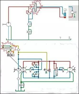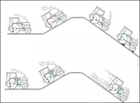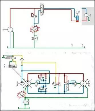下面兩幅圖中的車輛行走系統(tǒng)分別采用了開式和閉式液壓系統(tǒng),小伙伴們認(rèn)真比較一下看看二者制動效果的不同;