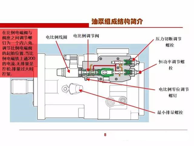 在挖掘機主泵應(yīng)用中,泵所占的比例最大,把泵的機械變量頂糸旋進就會改變泵的斜盤的角度,如果要變動此頂糸位置前一定要先做好標記,因為此頂糸的原位置是要保持泵斜盤有一定值的最小角度而不是零度,這個最小角度用于保證泵有最小的排量油液,這個最小排量的“油”是用于泵液控變量機構(gòu)用的。