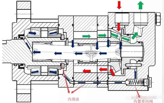 下圖中青色的箭頭就是馬達(dá)內(nèi)泄油的流動通道,滲入殼體內(nèi)部的液壓油通過潤滑軸承之外,多余的液壓油會通過內(nèi)置單向閥排到回油口,從而降低了殼體內(nèi)部壓力。