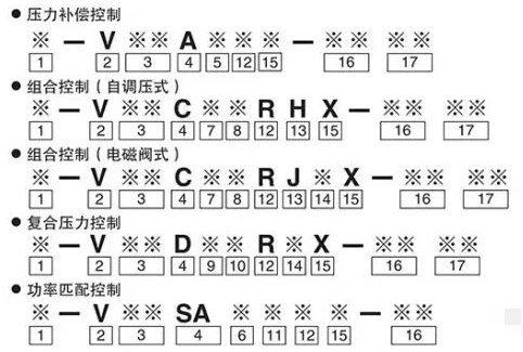 4、該字母代號表示的是這一系列油泵的控制方式一,該系列油泵可有多種控制方式并用不同字母表示,具體字母代號對應控制方式如下: